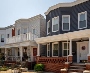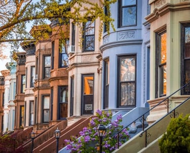 Classic brownstones renovated with modern amenities, nestled in tree-lined streets near the waterfront.